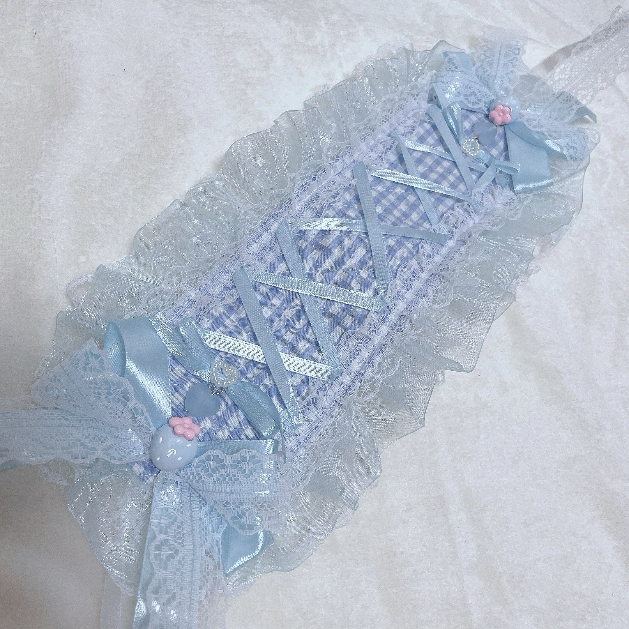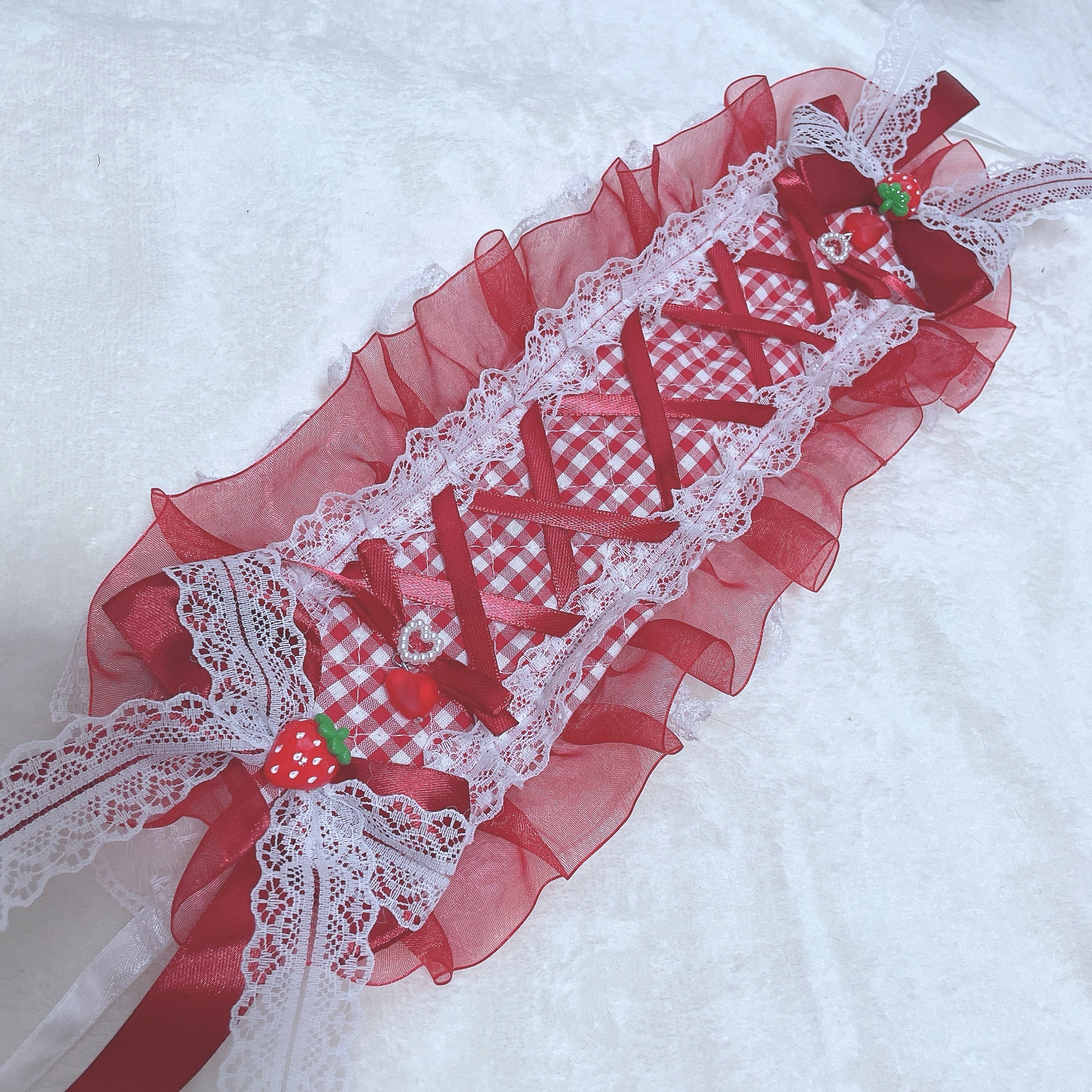 ギンガムチェックのキルト素材をベースに、ふわふわフリルといちごパーツが可愛らしいヘッドドレスです。