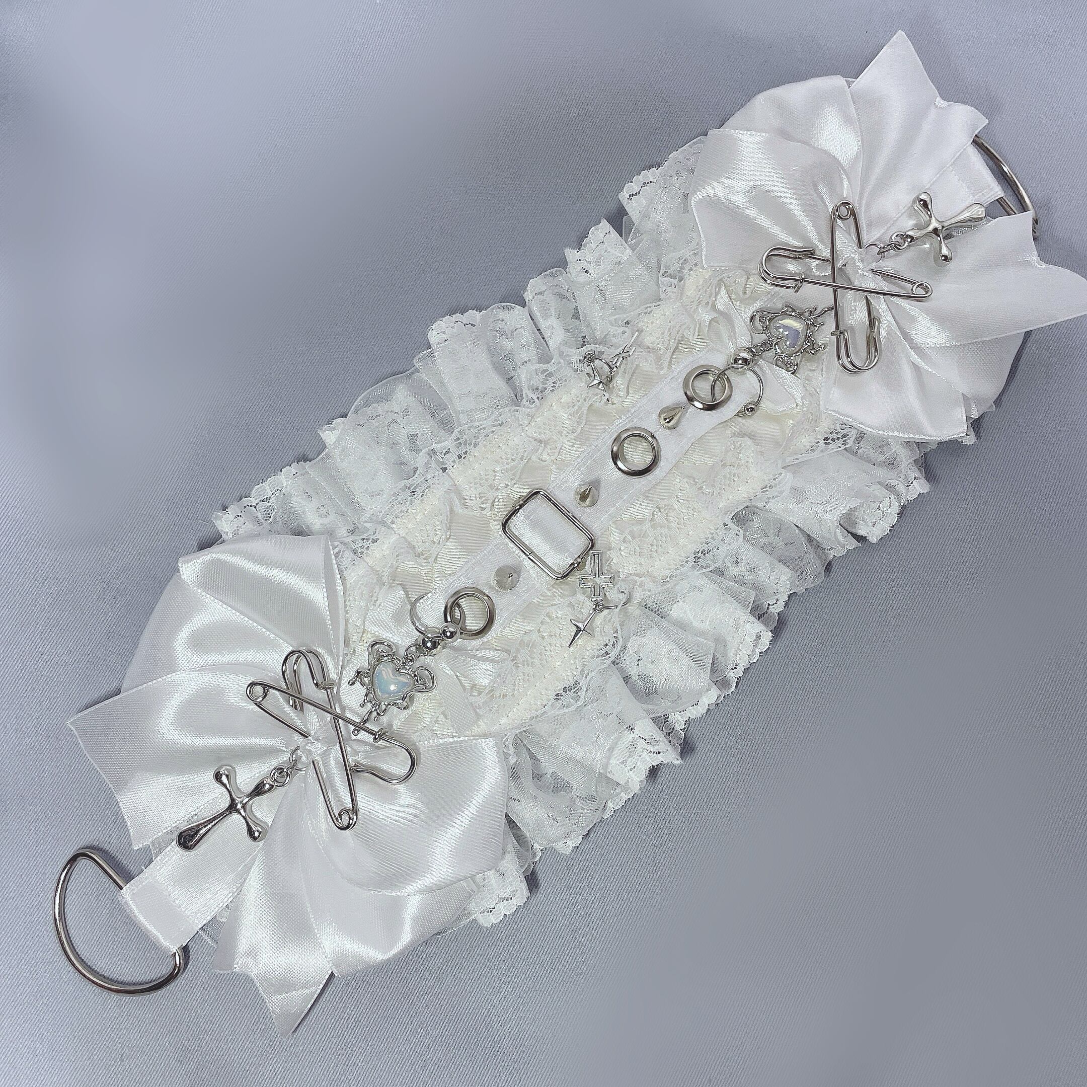 サテンキルト素材をベースに、スタッズやハトメを使ったベルトデザインのパンクなヘッドドレスです。
