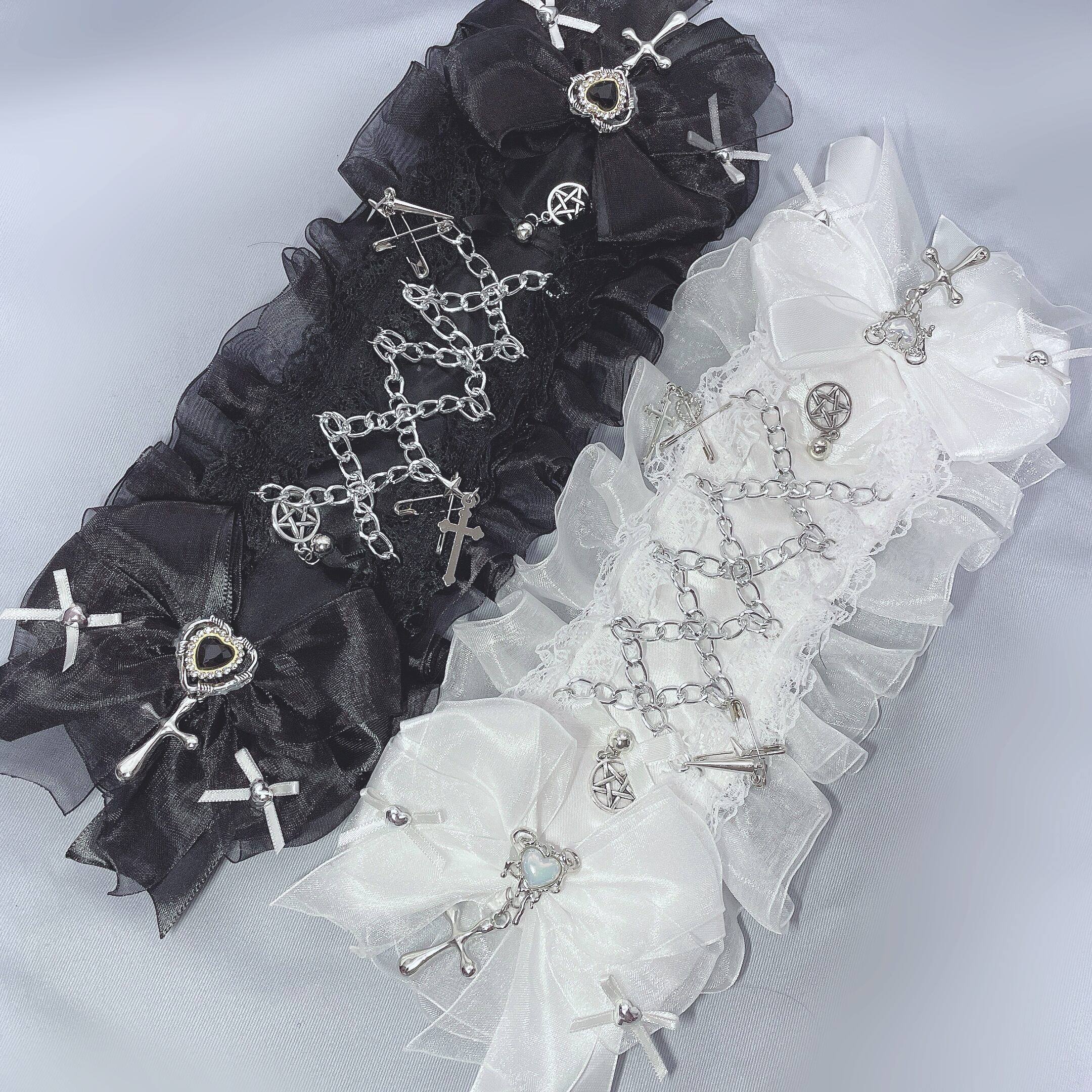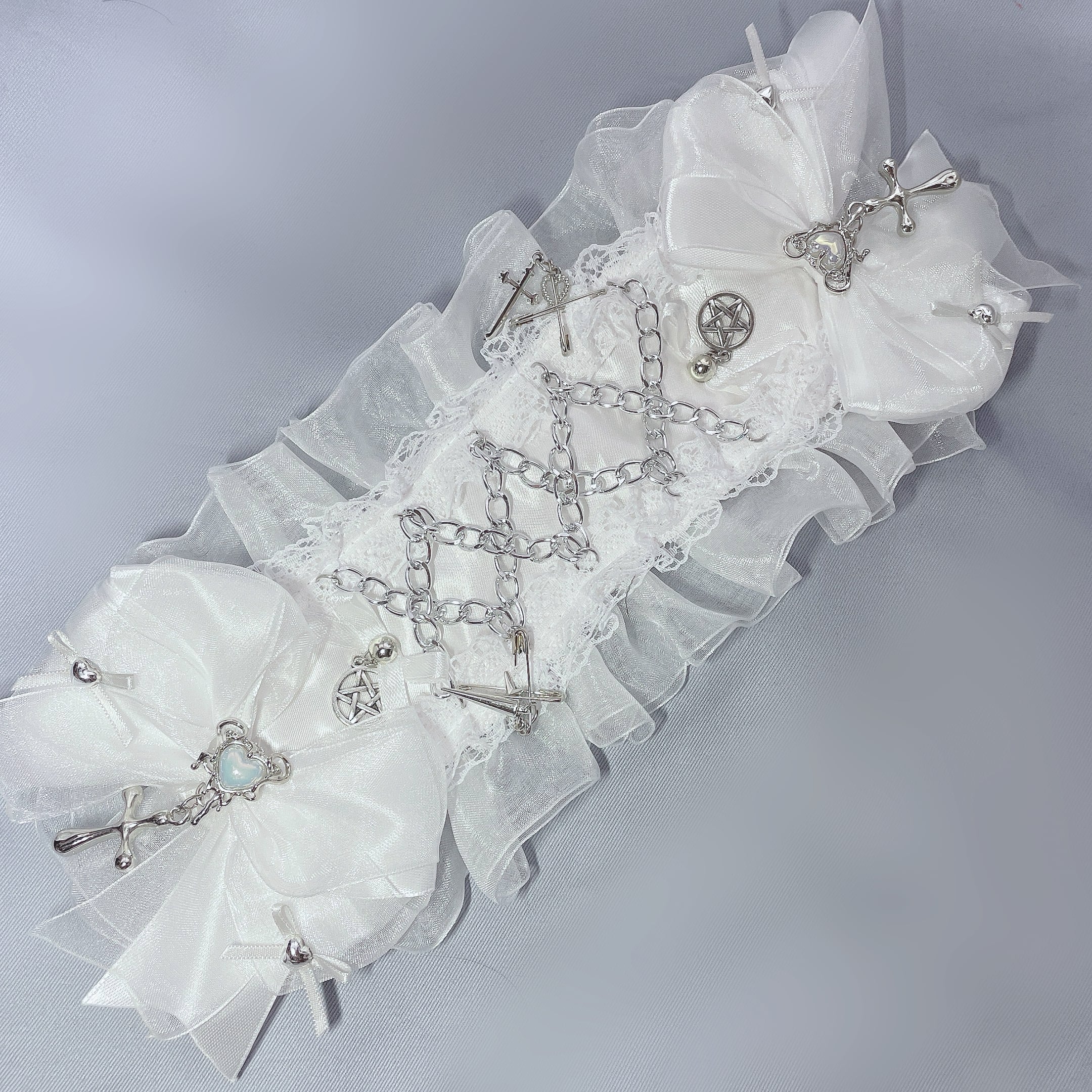 チェーンの編み込みを施した、パンクなデザインのヘッドドレスです。それぞれのチャームも細かくこだわってつけています。