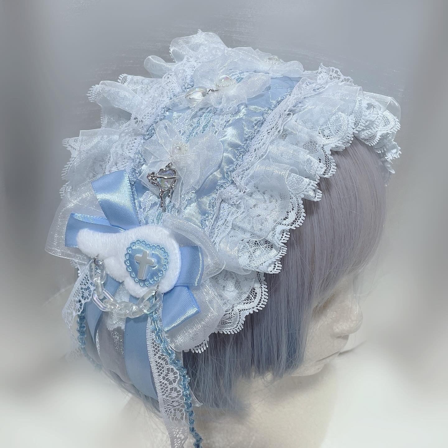 キルト生地をベースに、オーガンジーのフワッとリボンが可愛いデザインのヘッドドレスです。
