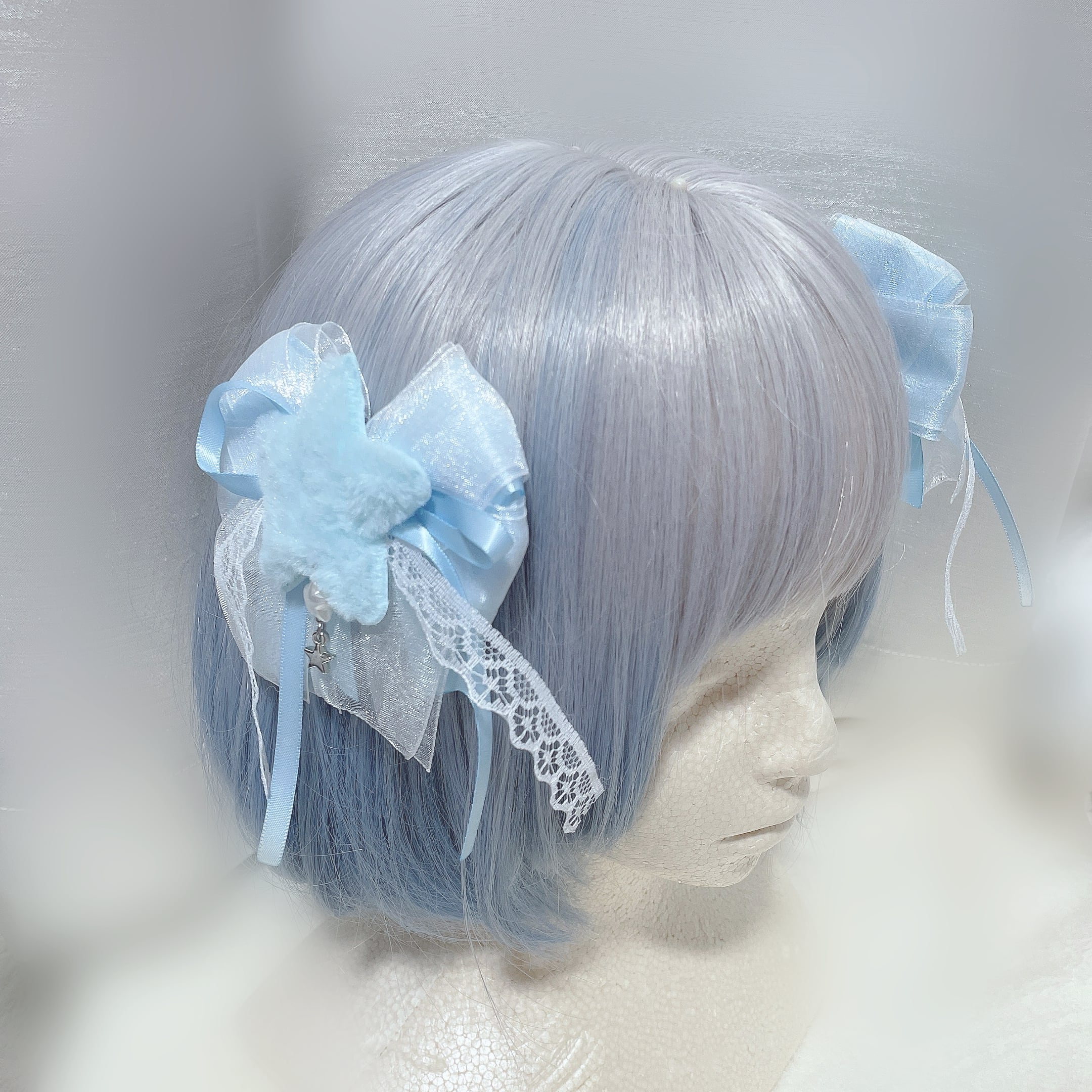 ふわふわの星モチーフのリボンのヘアピンです。重ねたリボンの垂れ感も可愛いです。