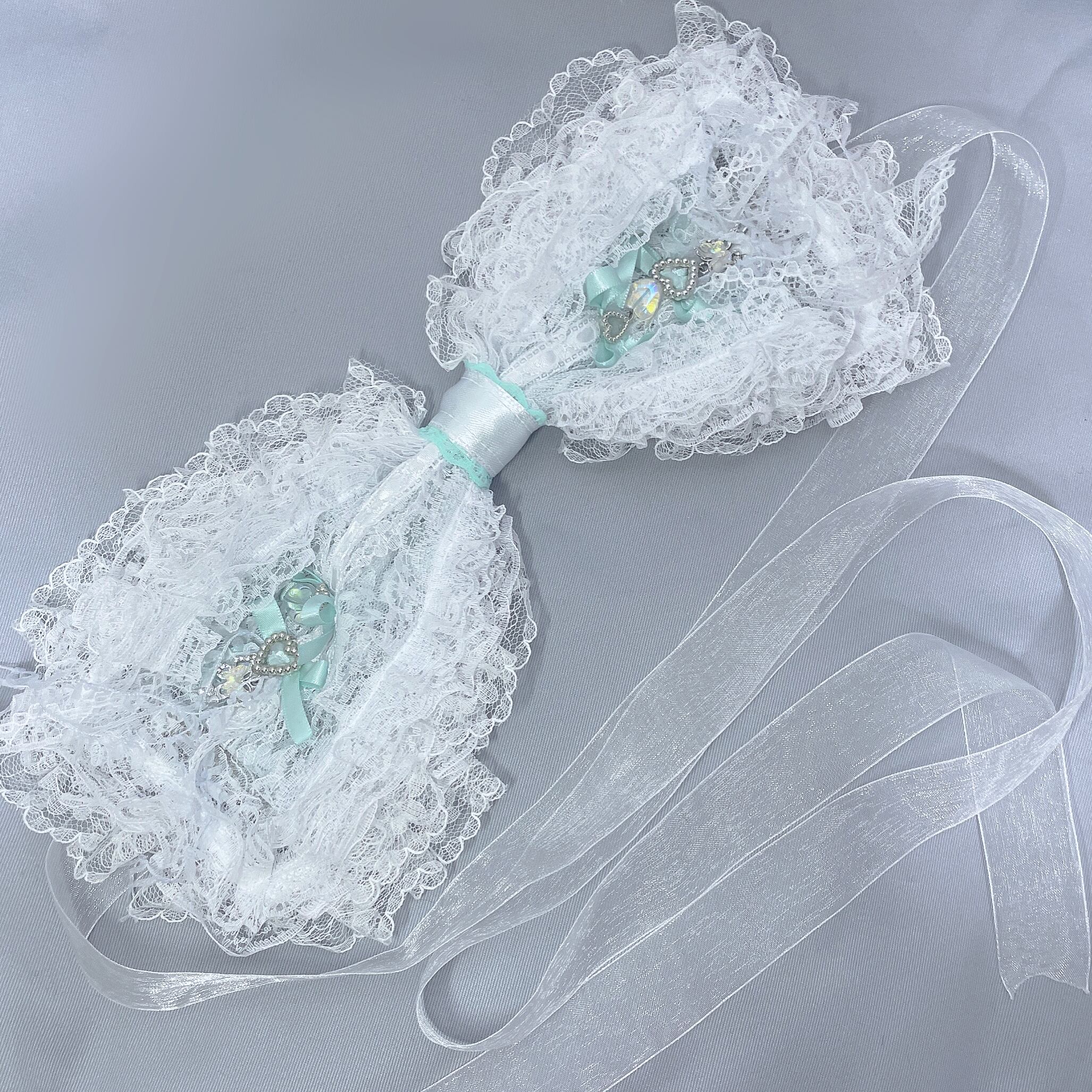 薄ミントグリーンと白レースをふんだんに使用した、リボン型ヘッドドレスです。フリフリのレースに、クリア系のチャームが付いた涼しげなデザインに仕上げました。