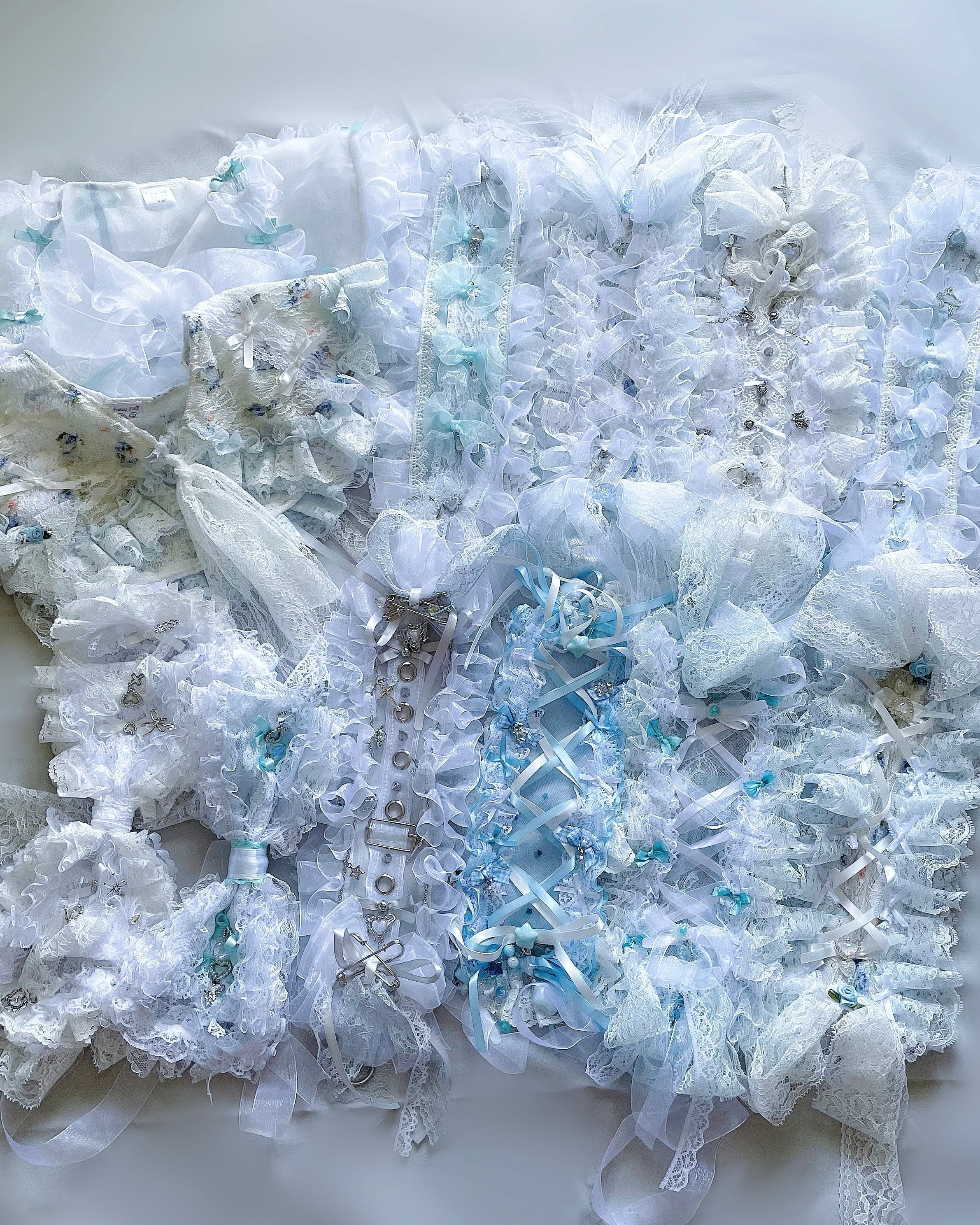 オーガンジーを使用した、透け感のあるヘッドドレスです。ふわっとリボンやサイドの垂れレースがクラゲのようなイメージで仕上げました。