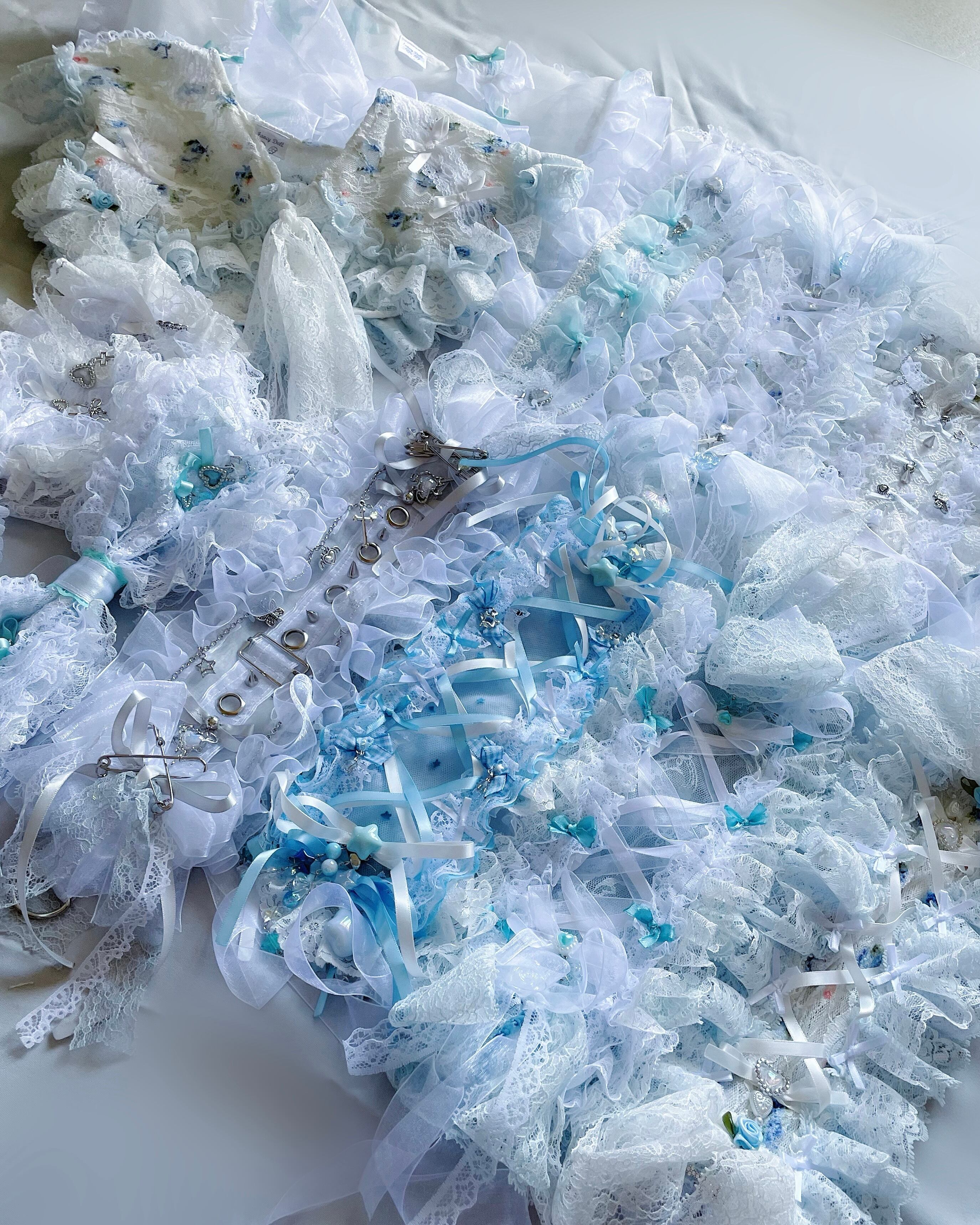 オーガンジーを使用した、透け感のあるヘッドドレスです。ふわっとリボンやサイドの垂れレースがクラゲのようなイメージで仕上げました。