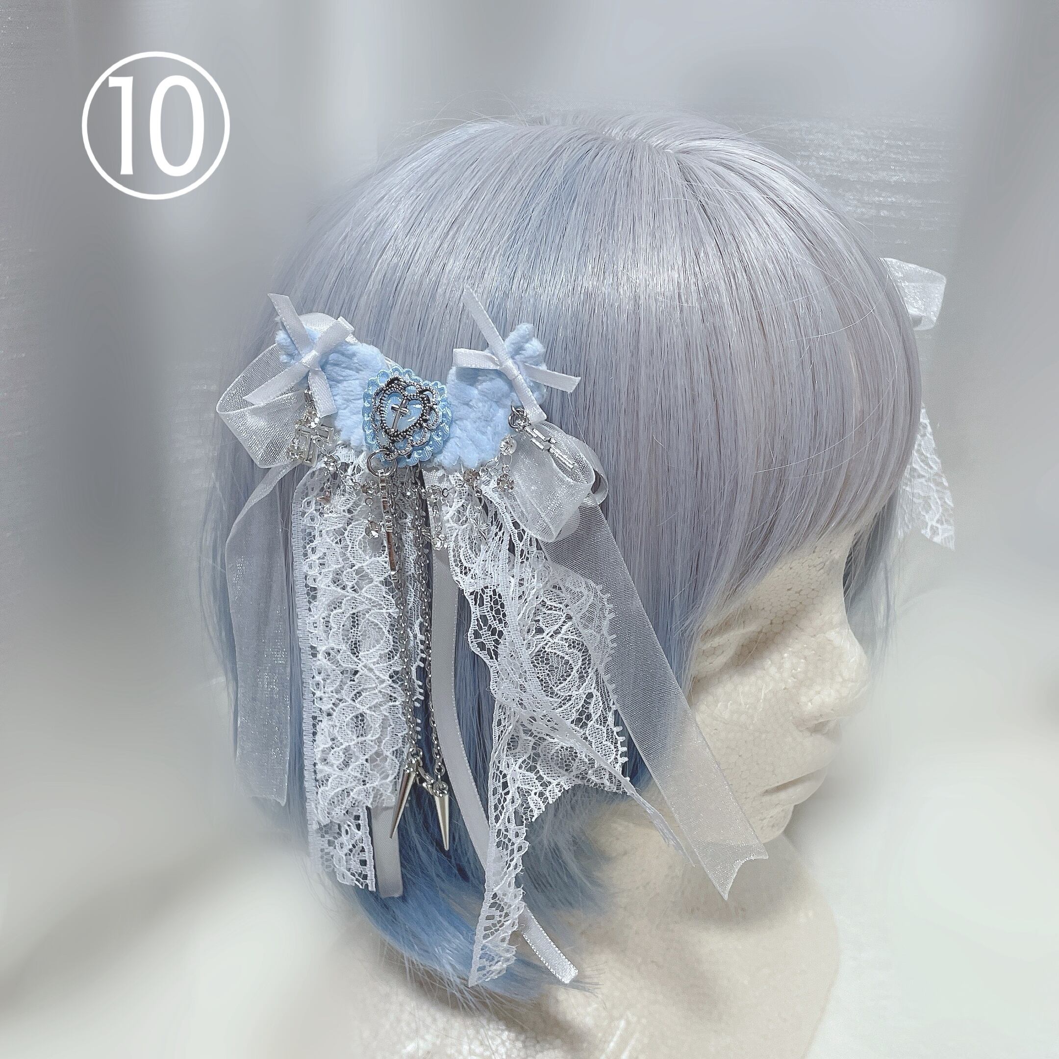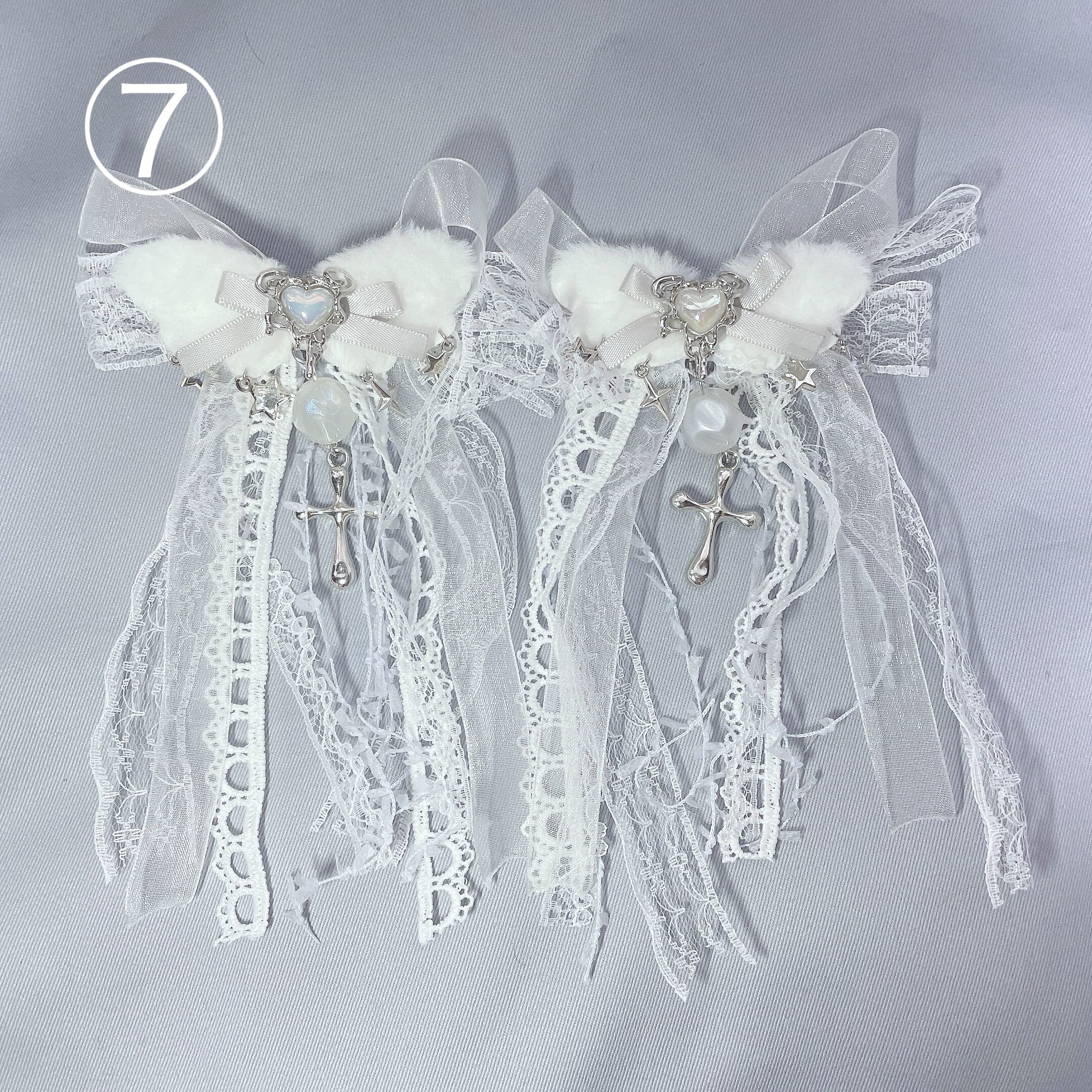 長めの垂れたリボンやレースがフリフリ可愛いリボンのヘアピンです。それぞれに合わせたパーツやチャームも細かくこだわって仕上げています。