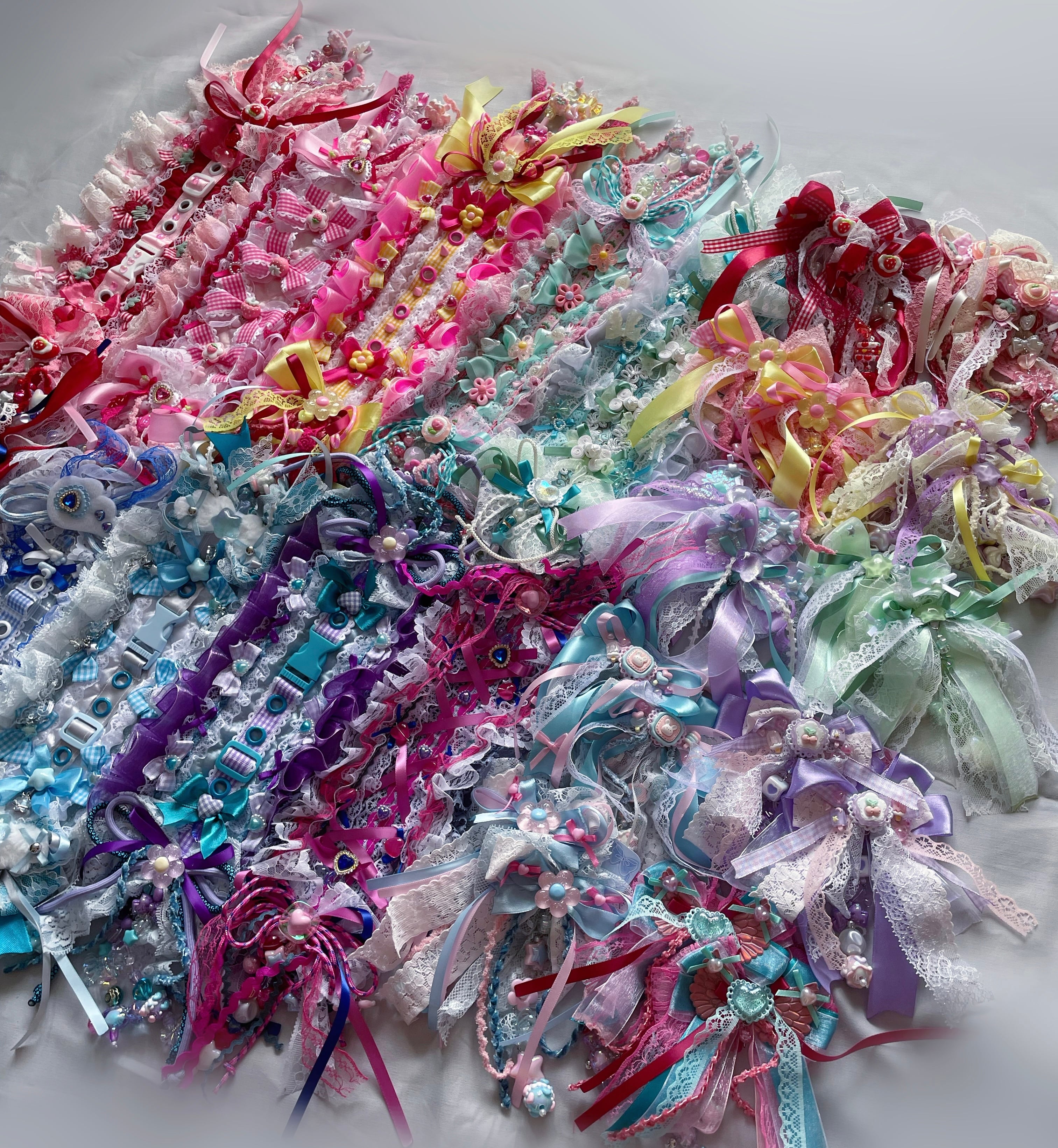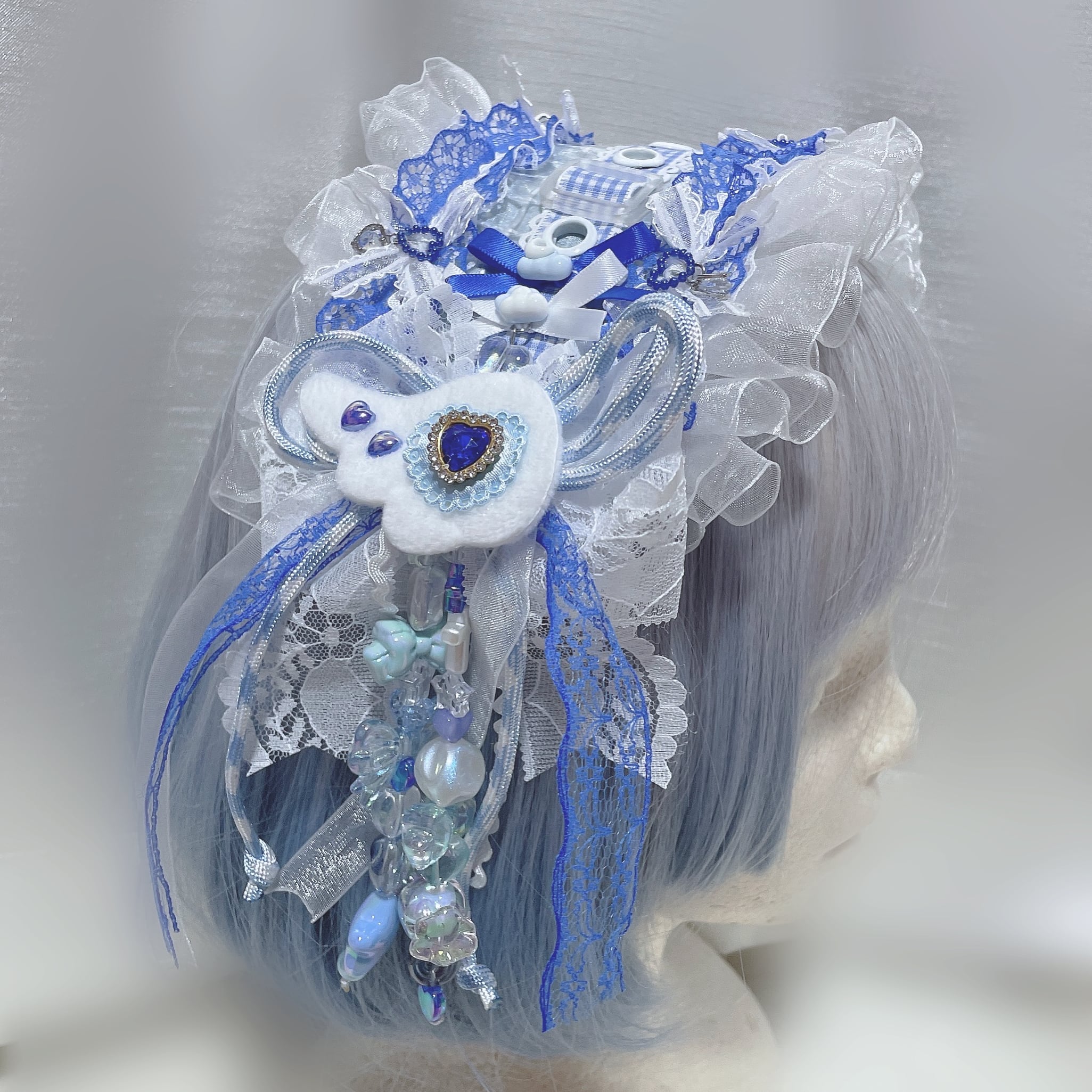 青色×クリアな素材を使った、天使っぽさやサイバー感もあるヘッドドレスです!ボリューミーな透けフリルや、バックルベルトデザインが可愛いらしいデザインに仕上げました