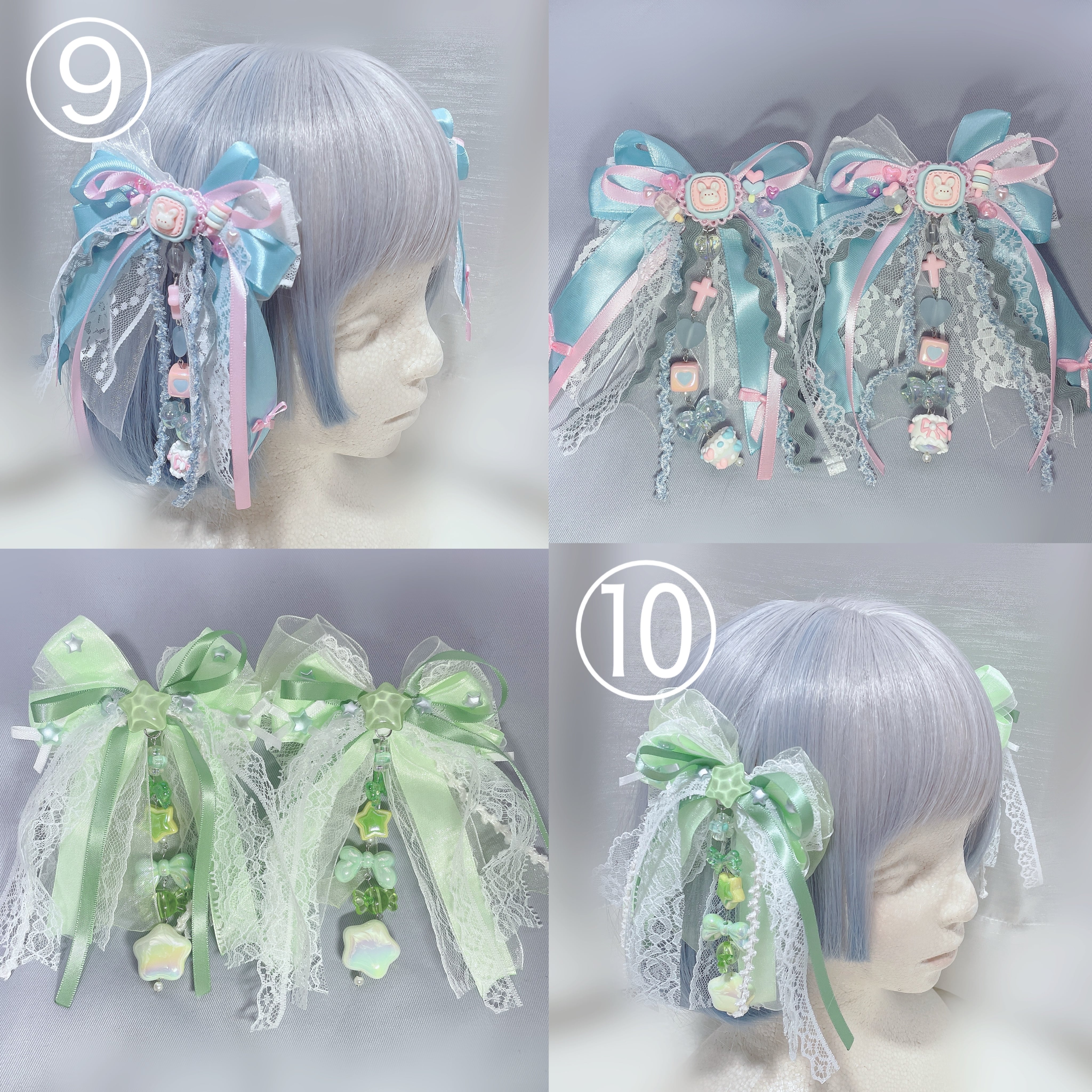 ちょっぴりパステルカラーのリボンヘアピンです。フワフワの垂れレース、キラキラの揺れチャームがとっても可愛いリボンです。