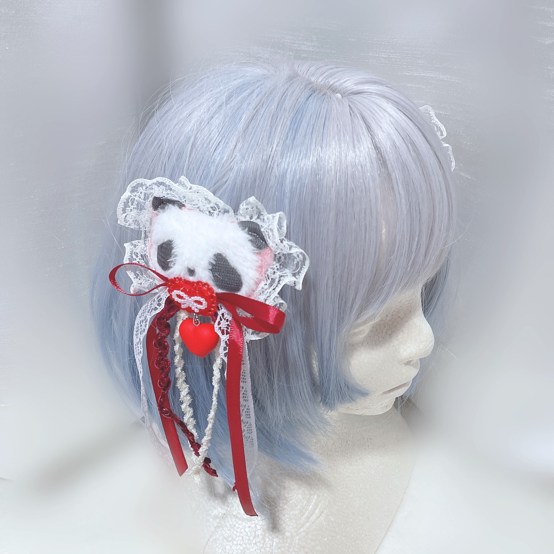 赤のタータンチェックキルトをベースに、レースをたっぷり使ってフワフワに仕上げました。パンダは取り外し可能なので、パンダ付きヘドレ、ヘドレのみ、パンダのみの3wayで使えます。