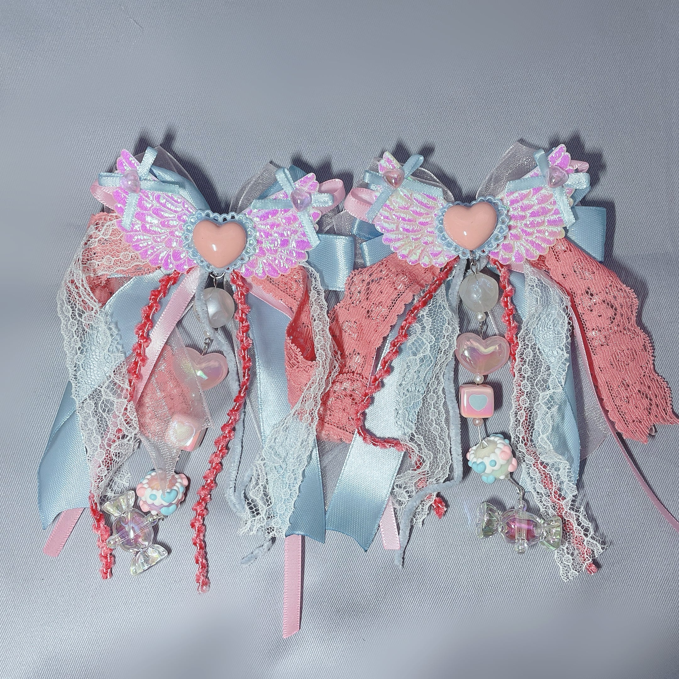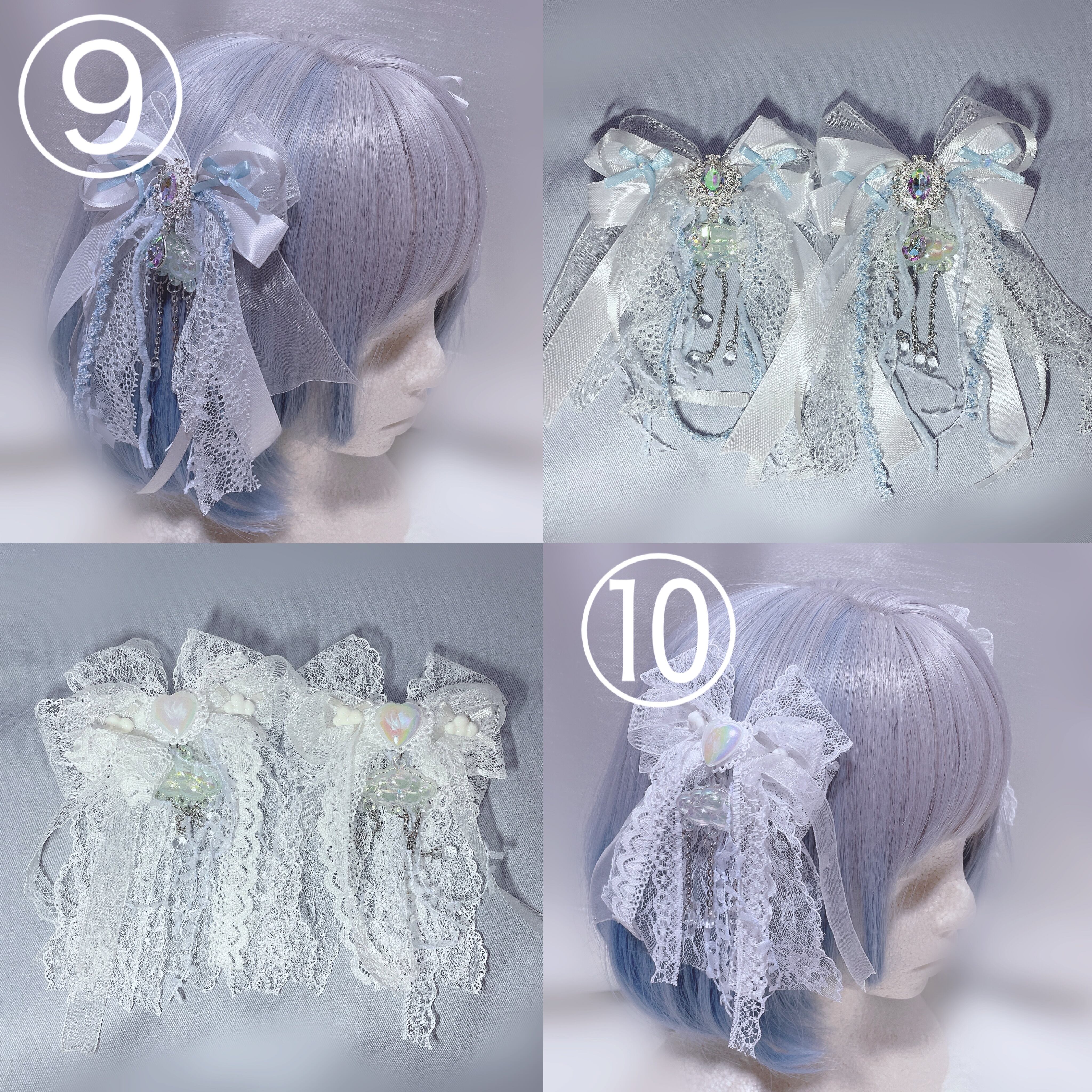 ふわふわレースやこだわったチャームが垂れて可愛いリボンのヘアピンです。髪の毛の両サイドに付けたり、1つでもボリュームがあって可愛くなります。