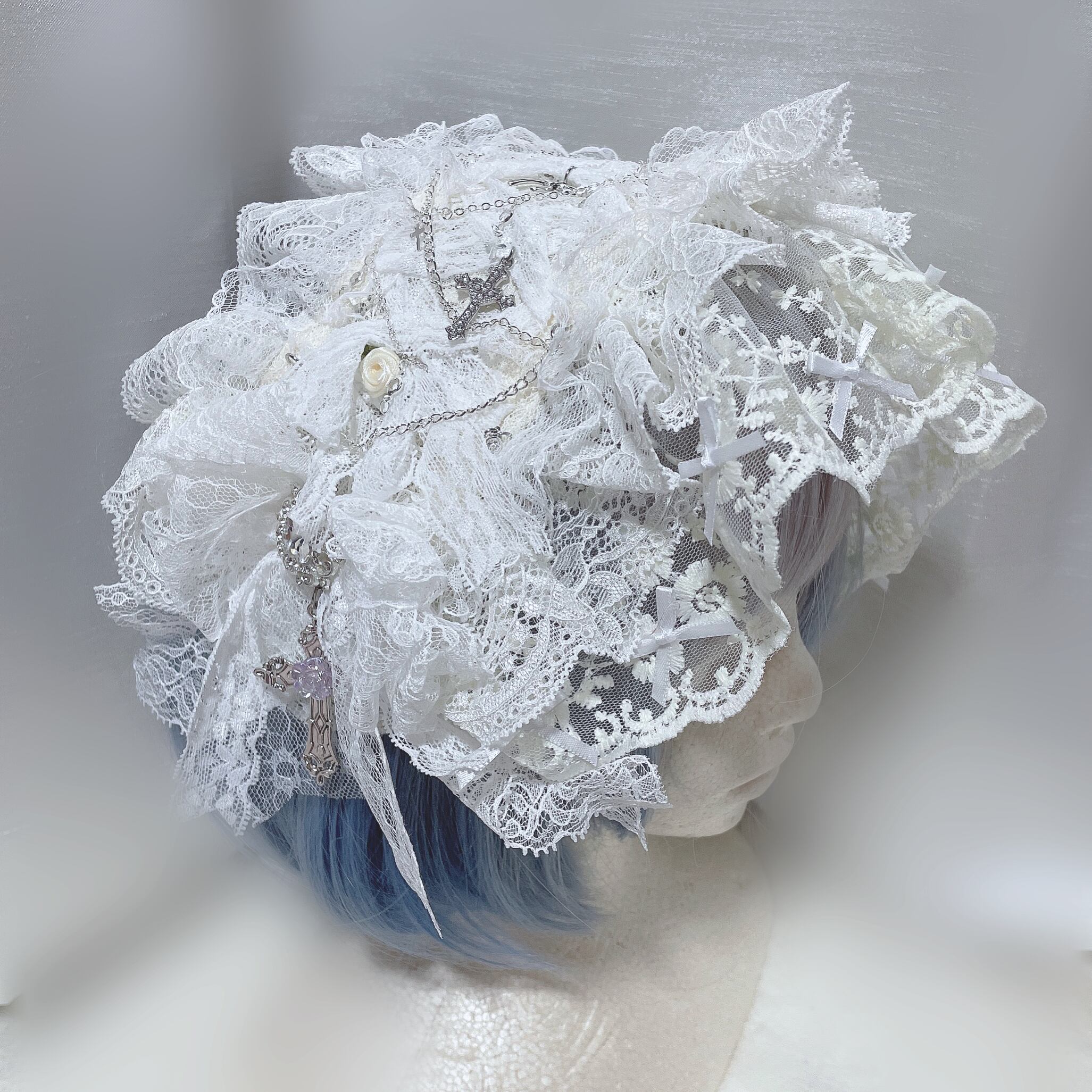 白レースをたっぷり使ってフワフワに仕上げたハーフボンネット風のヘッドドレスです。ボリューミーなレースやアクセントのシルバーチャームがとっても可愛らしいデザインです。