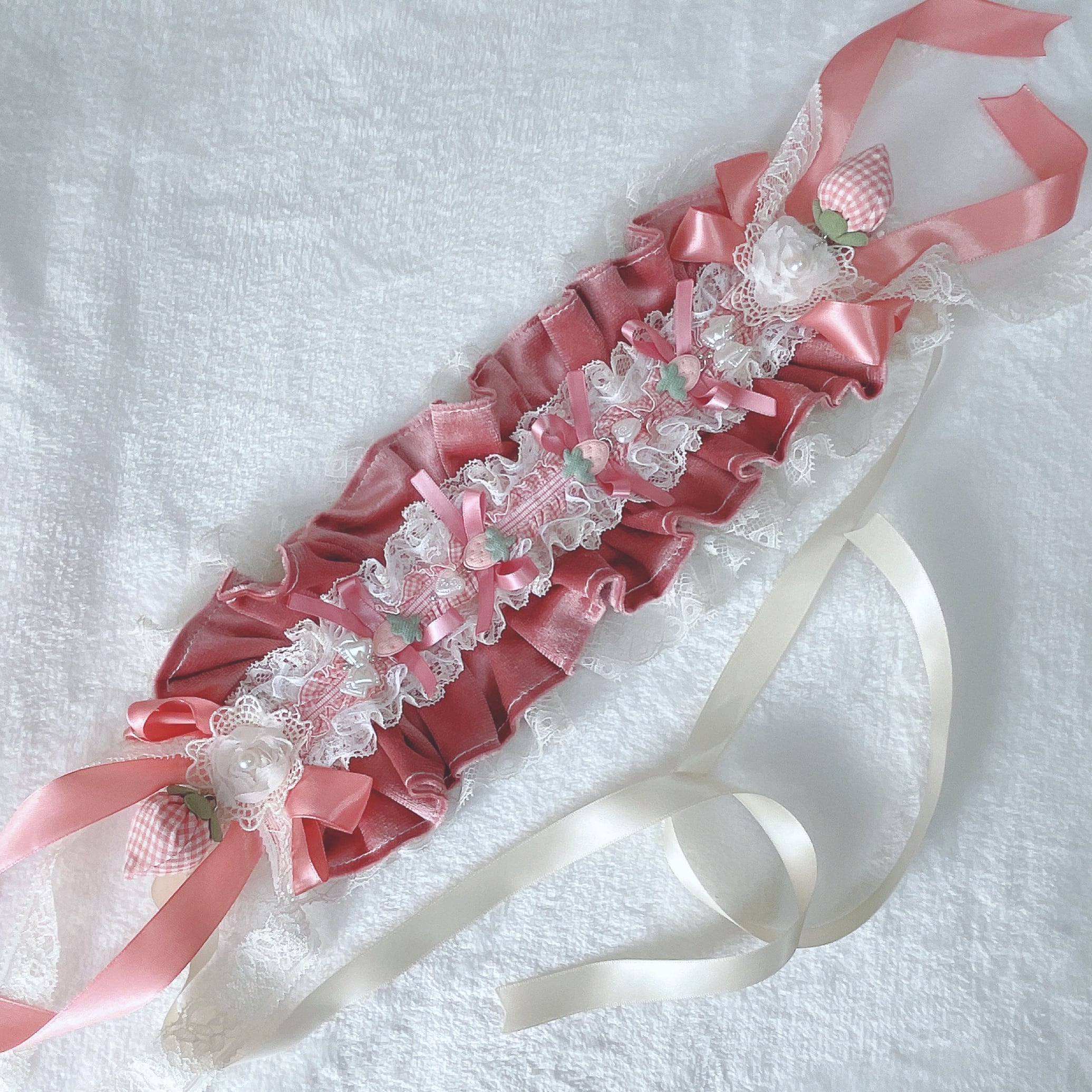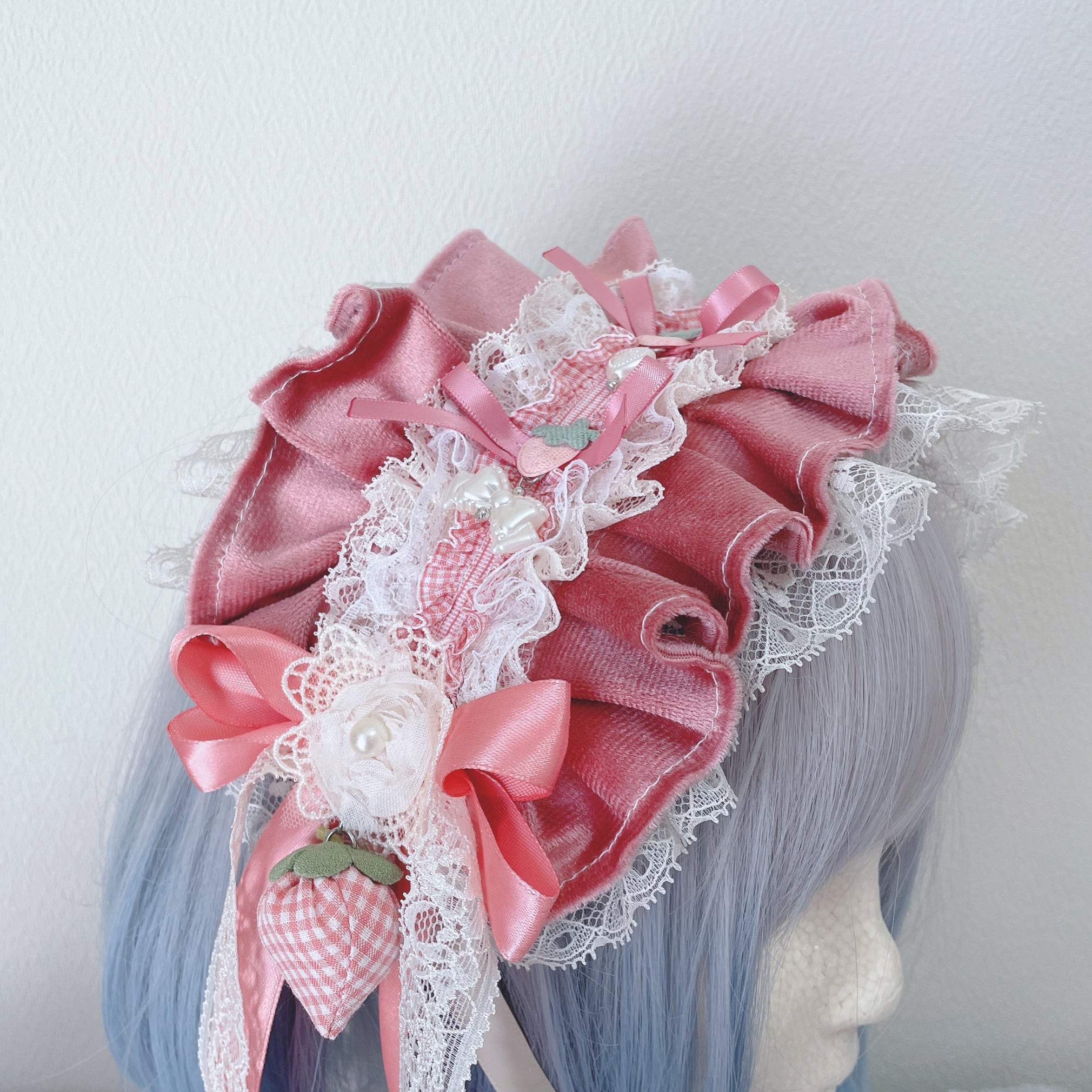 何段にも重ねたフリルがボリューミーで美しいヘッドドレスです!サイドの長めリボンや、いちごのモチーフまで可愛らしく仕上げました!