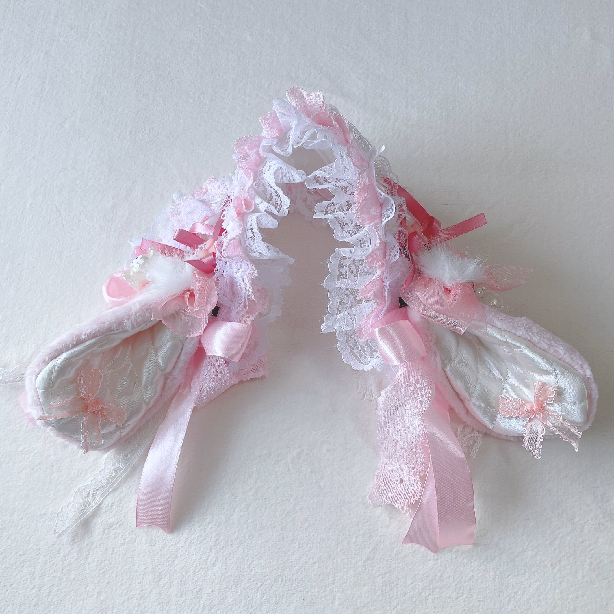 ピンクのふわもこ素材を使った、垂れ耳付きヘッドドレス♡甘々キュートなうさぎをイメージして、パーツなどもうさちゃんで統一しました♡